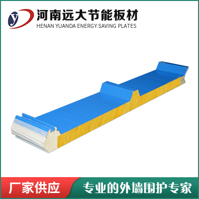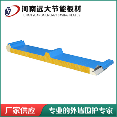 上壓型鋼板、優(yōu)質(zhì)巖棉材料、下壓型鋼板、兩側(cè)為聚氨酯。