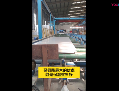 我們公司引進(jìn)意大利賽浦連續(xù)生產(chǎn)線,采用了六組份在線工業(yè)微機(jī)自動(dòng)操作(SIEMENS)混合澆注技術(shù)。生產(chǎn)流程分為開卷覆膜—壓制成型—鋼板預(yù)熱—高壓發(fā)泡—高溫固化—鋸切—板材冷卻—碼垛—自動(dòng)打包等功能與一體的自動(dòng)化生產(chǎn)線,年生產(chǎn)能力為130萬(wàn)平方米。